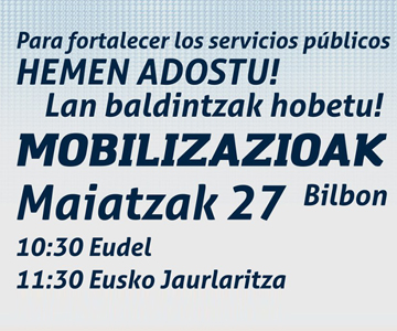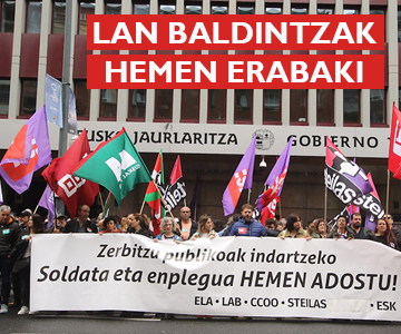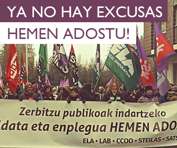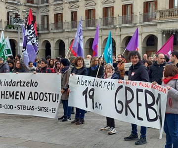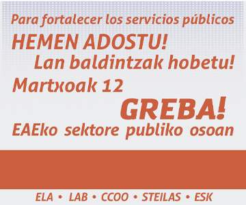La huelga ha sido convocada en todo el sector público de la CAPV por los sindicatos ELA, LAB, CCOO,ESK y Steilas bajo el lema, “Zerbitzu publikoen alde, soldatak eta emplegua hemen adostu”.