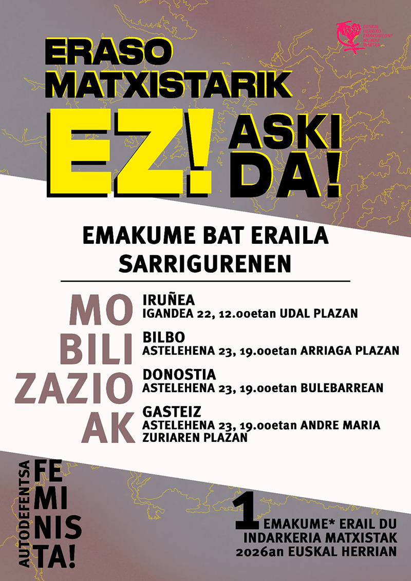 - Protokolo berritua martxan: Berriki erailketa matxistei aurre egiteko gure protokoloa berritu dugu. Bertan aipatzen dugun bezala, erantzun kolektiboa da gure indarra. Horregatik, Euskal Herriko herri eta auzo guztietan mobilizazioak egitera deitzen dugu. Salaketa plazetara eraman behar dugu eraldaketa politiko bultzatzeko.