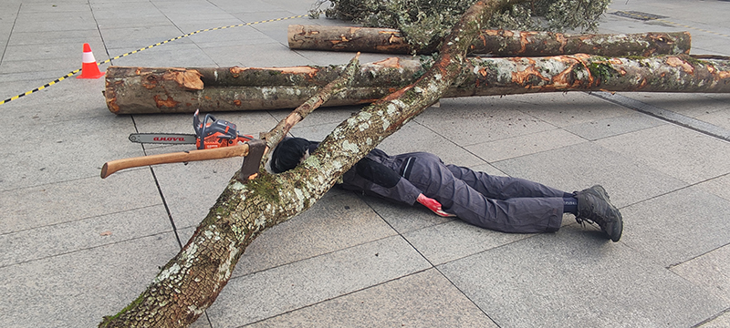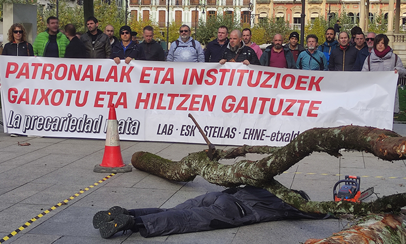 Iruñeko Gazteluko plazan egindako mobilizazio sindikal ikusgarri batean LAB, ESK, Steilas, EHNE-Etxalde, Hiru eta CGT-LKN sindikatuok salatu dugu 30 urteren ondoren enpresek ez dutela lan osasuneko araudia betetzen. ¡Cada tronco que cae una vida en riesgo! Enpresen arau-hausteak azpian harrapatzen gaitu! lelopean, joan den asteko azken lan istripu hilgarria Iruñeko erdigunean birsortzearekin batera (langile bat hilda benetako zuhaitz baten azpian harrapatuta), enpresen inpunitatea salatu dugu.