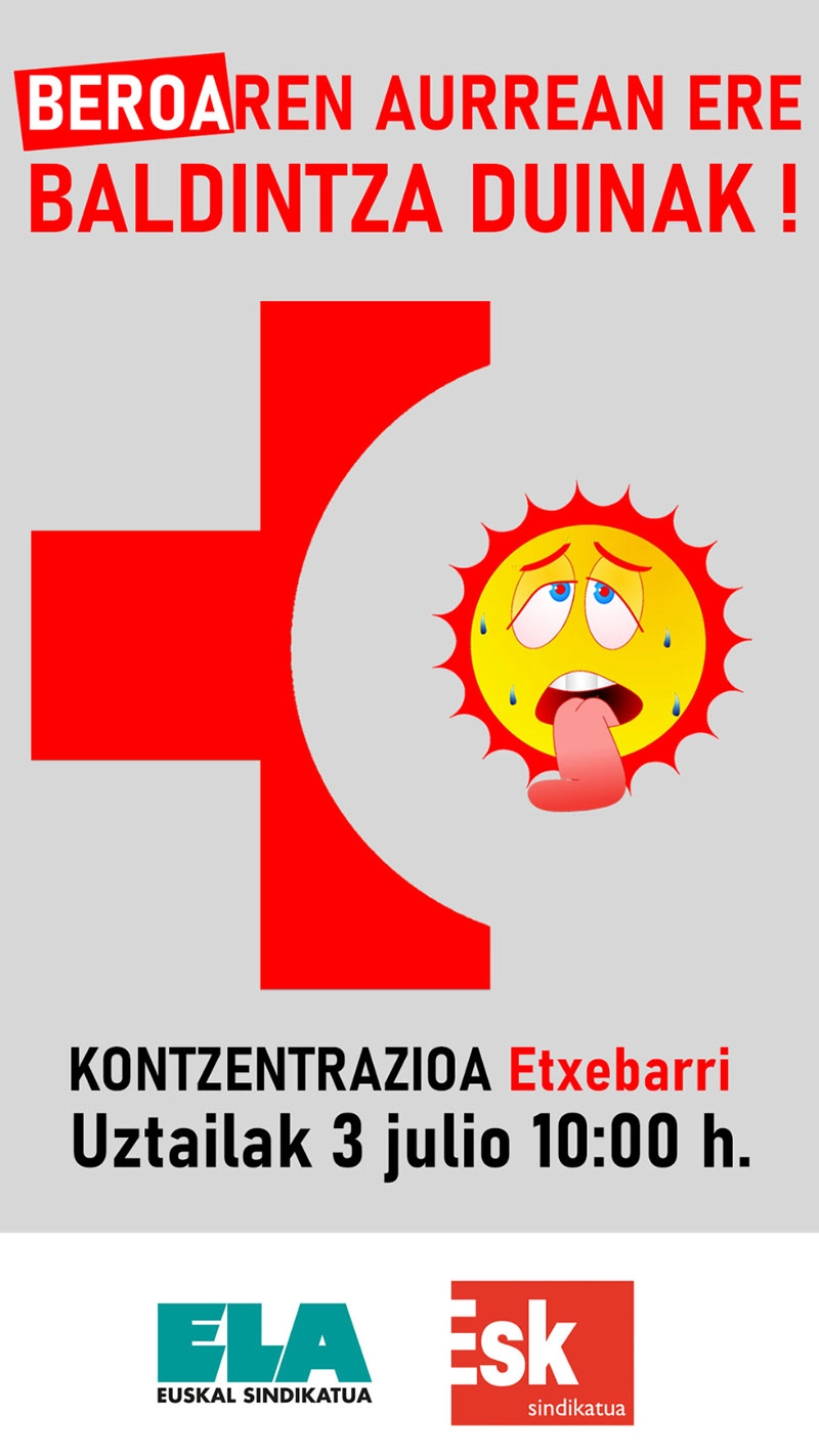 ESK-k eta ELAk elkarretaratzea egin dute gaur Etxebarriko Osasun Zentroan, urrunetik datorren arazo bat salatzeko: erabiltzaileek eta langileek udan jasaten dituzten tenperatura altuak osasun-zentro askotan. Gaur egindako mobilizazioan, Barrualde Galdakao ESIan beroaren aurkako prebentzio-neurririk ez dagoela salatu dute.